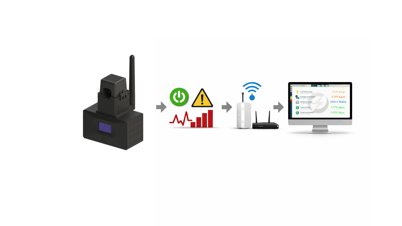 A través de un sensor no invasivo, captura información crítica como corriente, potencia y estado operativo, convirtiendo el consumo eléctrico en información útil para producción, mantenimiento y eficiencia.