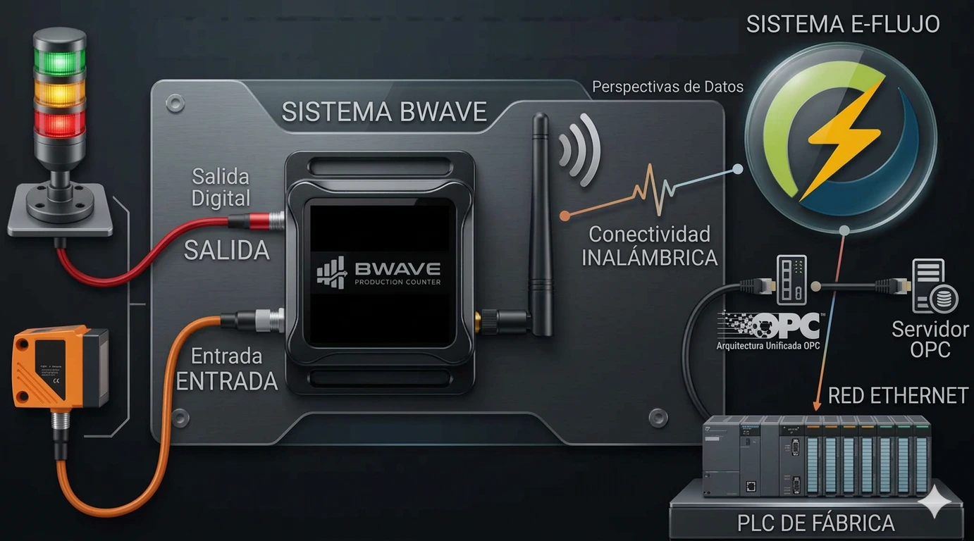 BWAVE funciona como un dispositivo de entrada y salida, adaptable a distintas señales de planta, permitiendo integrar variables como conteo de defectos, torretas, switches y otros sensores que enriquecen la visión del proceso.